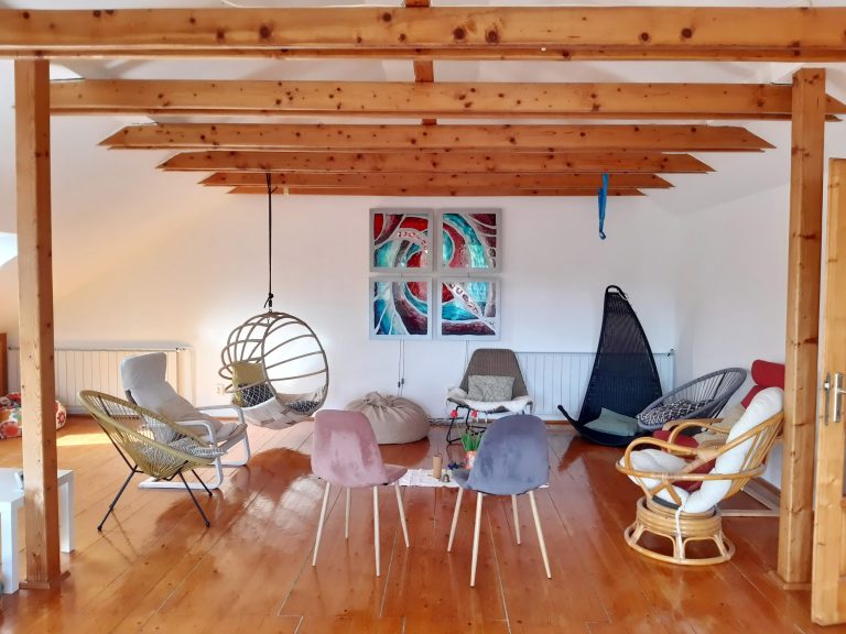 Alvás: földre tett ágybetéteken a tetőtérben és Ágnes műhelyszobájában, üvegfestmények között tudunk aludni.